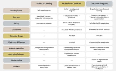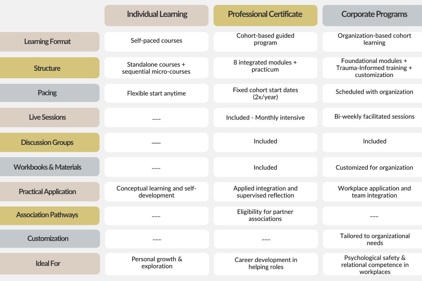 Our programs are designed to support reflective learning over time, integrating psychological insight, trauma-aware perspectives, and practical application. We place a strong emphasis on responsibility, boundaries, and respect for the complexity of emotional life.