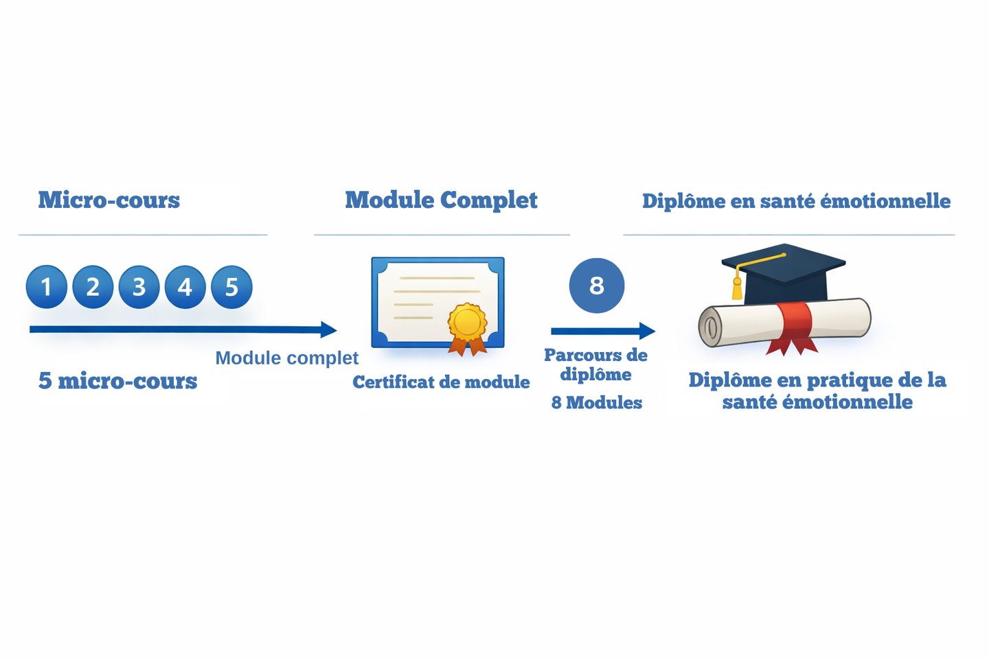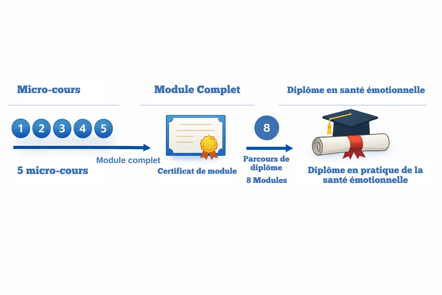 Notre formation comprend des micro-cours individuels, des modules certifiants composés de cinq micro-cours séquentiels, ainsi qu’un parcours de diplôme complet en pratique de la santé émotionnelle. Les apprenants peuvent commencer par des thématiques ciblées ou progresser à travers l’ensemble du curriculum à leur propre rythme.