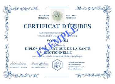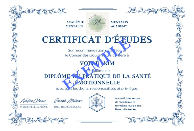 Le Diplôme en pratique de la santé émotionnelle est décerné à la suite de la complétion des huit modules de base du curriculum de l’Académie Mentalis.