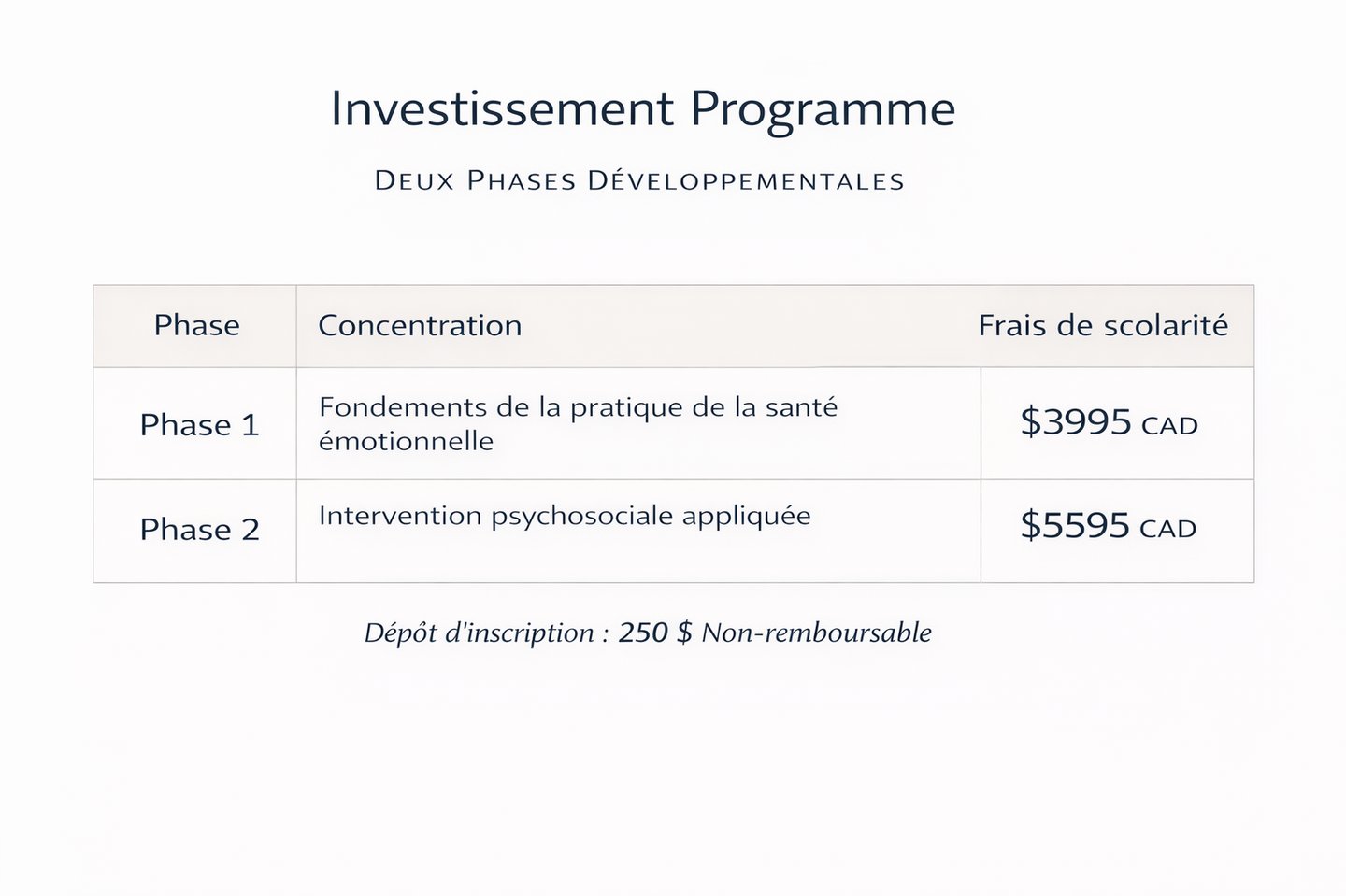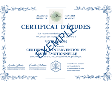 La certification reconnaît l’achèvement d’un parcours de formation professionnelle structuré intégrant des connaissances en santé émotionnelle, des compétences en intervention psychosociale, un apprentissage appliqué et une pratique éthique.