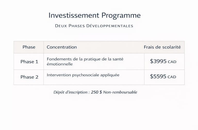 Ce programme offre une formation structurée et contribue au développement professionnel. Il ne constitue pas une formation en psychothérapie et ne mène pas à l’obtention d’un permis d’exercice clinique.