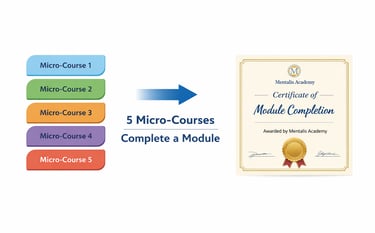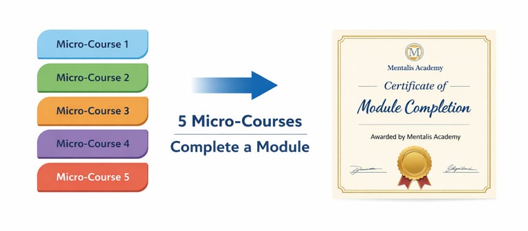 Micro-courses may be taken individually as sequential learning steps or completed together as part of a full module. Completion of all five micro-courses within a module grants a Certificate of Module Completion, recognizing integrated study within that topic area.